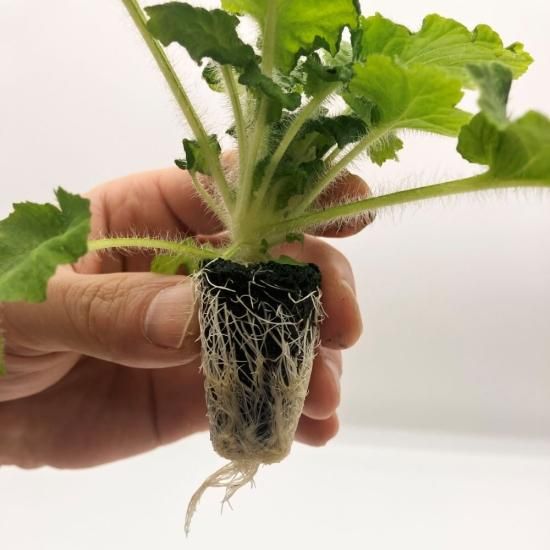 育苗ポットは天然ピートモスとココヤシ素材を使用。根に土が付いていないので洗い流す手間もなく、そのままポットごと植え付けできます。さらにポットごと収穫して、根付きのまま出荷できるので、手間いらずで鮮度も長持ちします。プラスチックごみも出さず、人にも環境にも優しい苗です。(土耕栽培にも使用できます。)