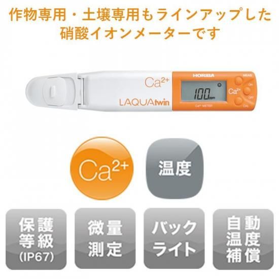 土壌・栽培管理・食品・健康管理・珊瑚の飼育水・河川・湖沼の硬度測定などに。LAQUAtwin独自の選択性にすぐれた平面型カルシウムイオンセンサを採用し、少量(0.3mL〜)のサンプルを直接滴下するだけで測定可能です。